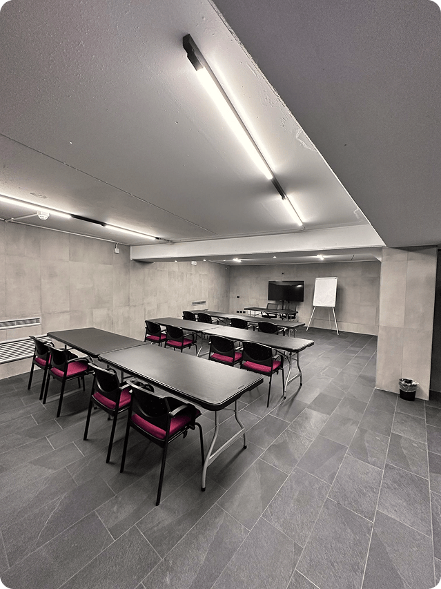 Completamente attrezzate con schermo, lavagna a fogli mobili e sistema audio, le nostre sale garantiscono il massimo comfort.